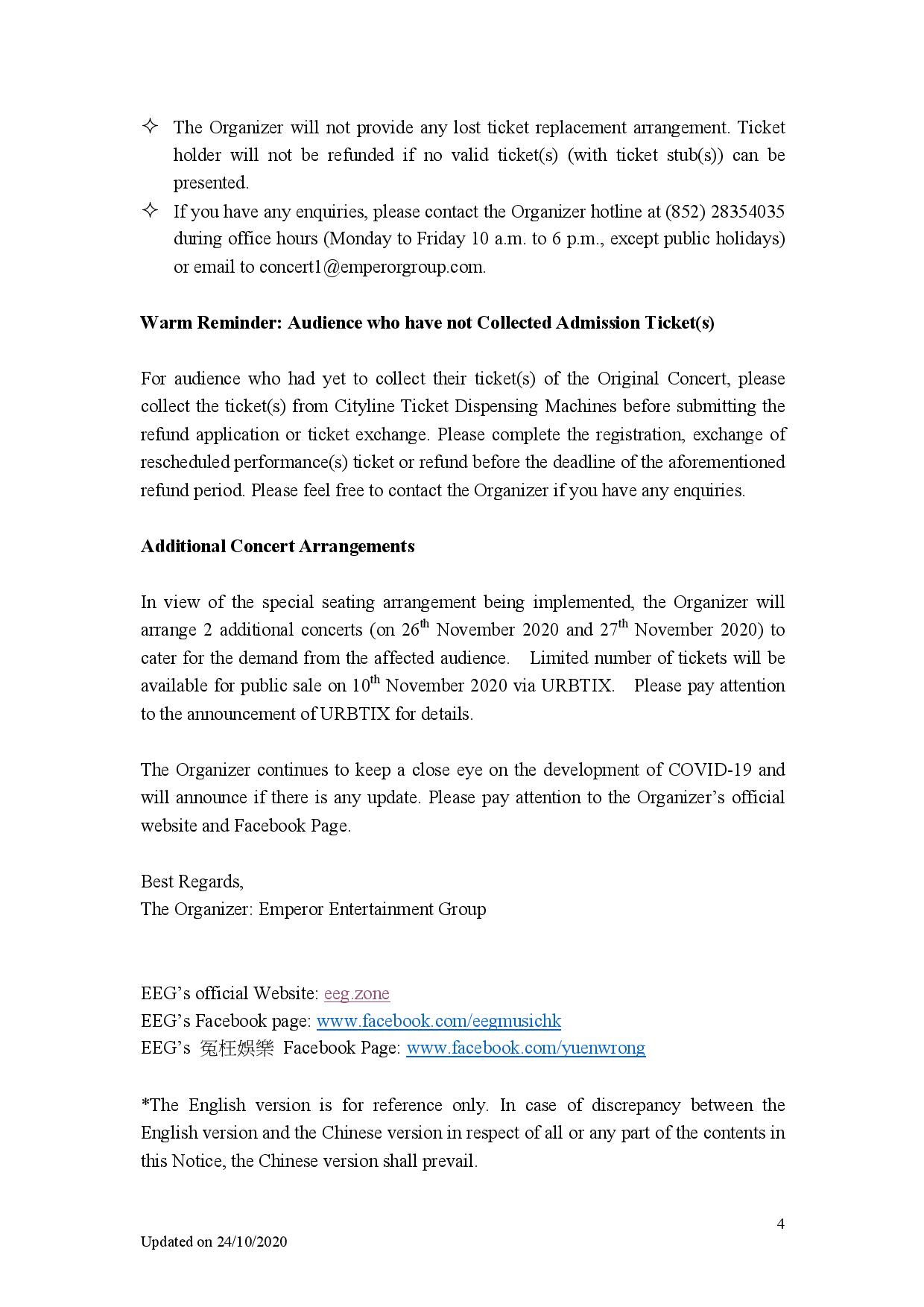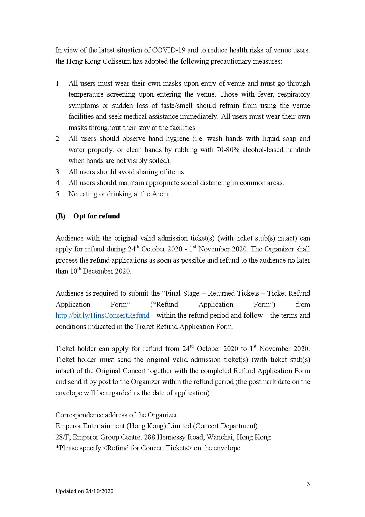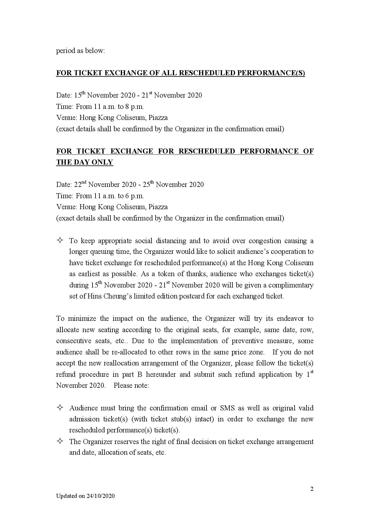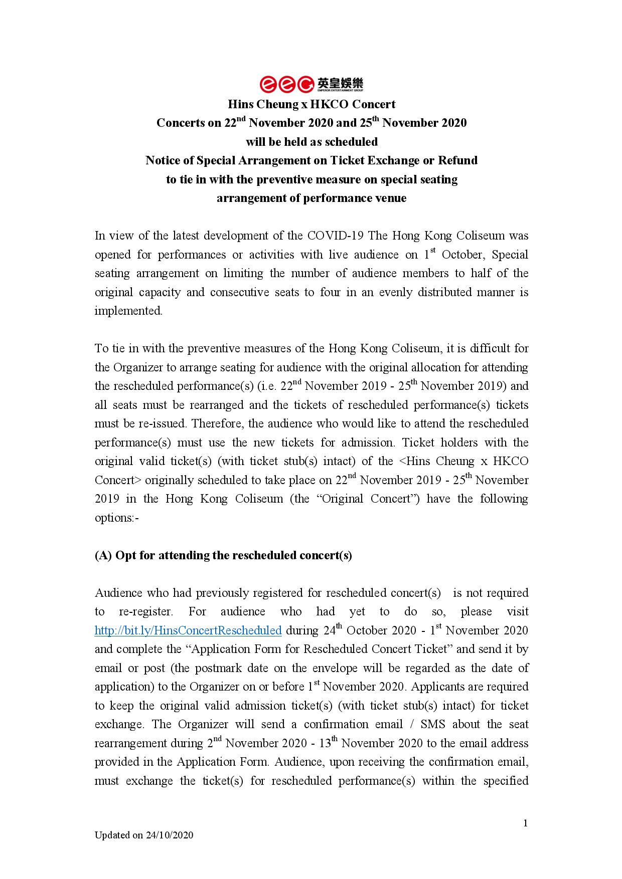 Hins Chueng x HKCO - Notice of Special Arrangement on Ticket Exchange or Refund